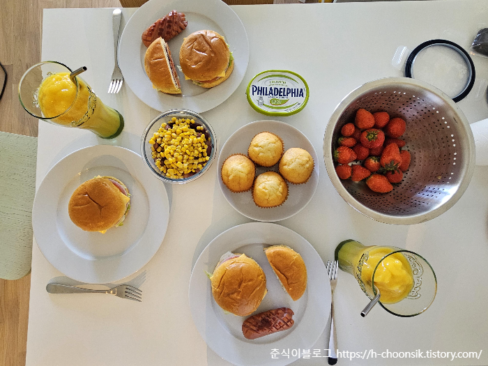 오늘의 아침 메뉴는 매형표 수제버거, 소세지, 머핀, 콘샐러드, 딸기, 스무디